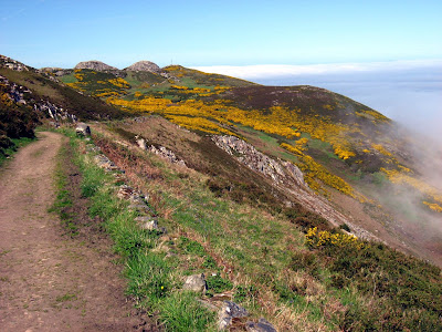 Pour monter jusqu'à la croix en haut du Bray Head (240m), le sentier s'élève au milieu des buissons et de quelques arbres secs.